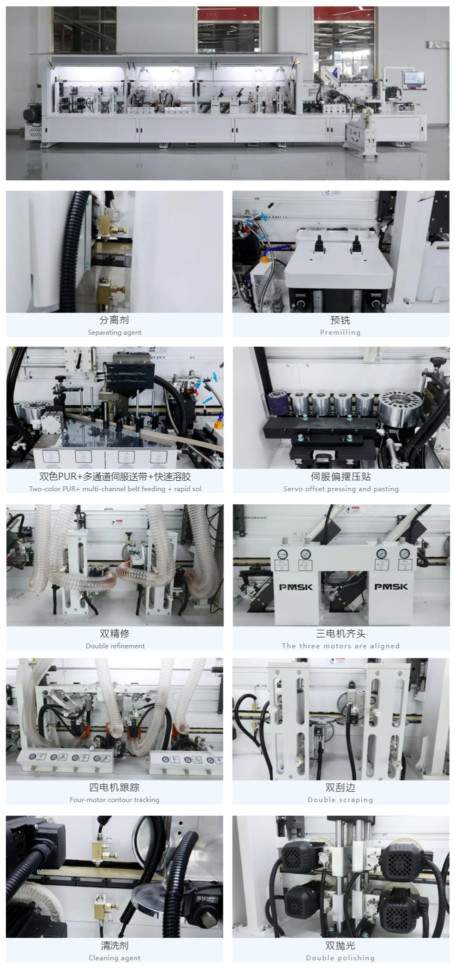 多通道伺服送帶,不同封邊條快速切換,伺服送帶減少封邊帶浪費(fèi),提升封邊穩(wěn)定性和效率。伺服涂膠,動(dòng)作快速精準(zhǔn),涂膠連續(xù)性好,穩(wěn)定性高。